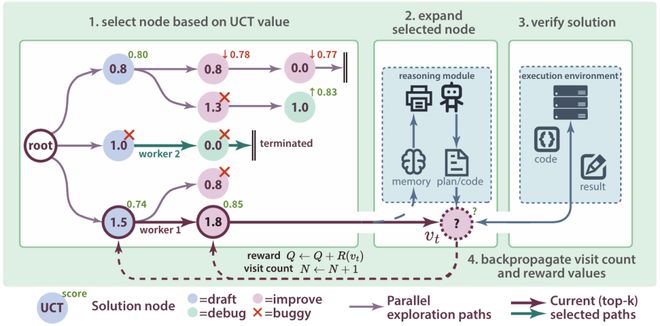 MCTS启发的树搜索:利用蒙特卡洛树搜索,将研发AI过程建模为决策树,每个节点代表一个AI方案的状态。