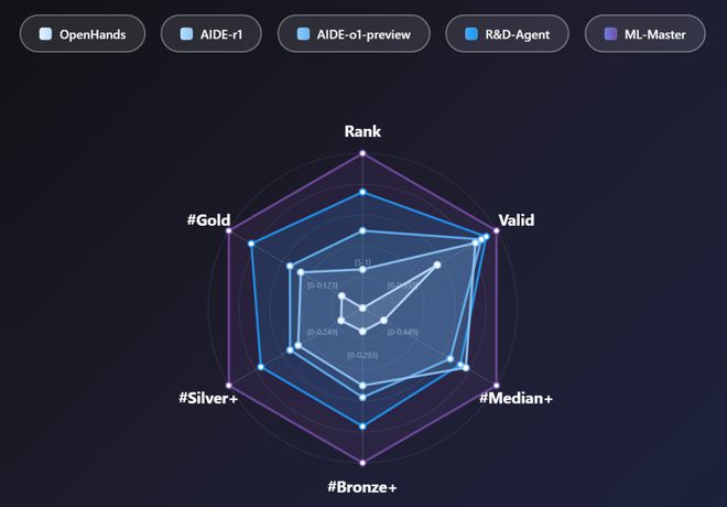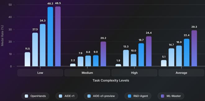 ML-Master在各难度级别的领先表现体现了其卓越的泛化能力,能够在不同复杂度的挑战中保持高水平的稳定性。